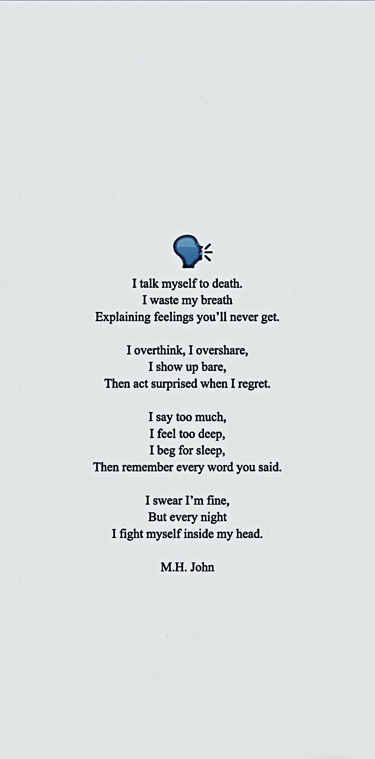 This poem captures the exhaustion of over feeling and over explaining yourself, your emotions, your mind…and the quiet spiral of replaying conversations long after they’ve ended. It’s about the mind as both refuge and battleground, and the fragile line between vulnerability and regret.