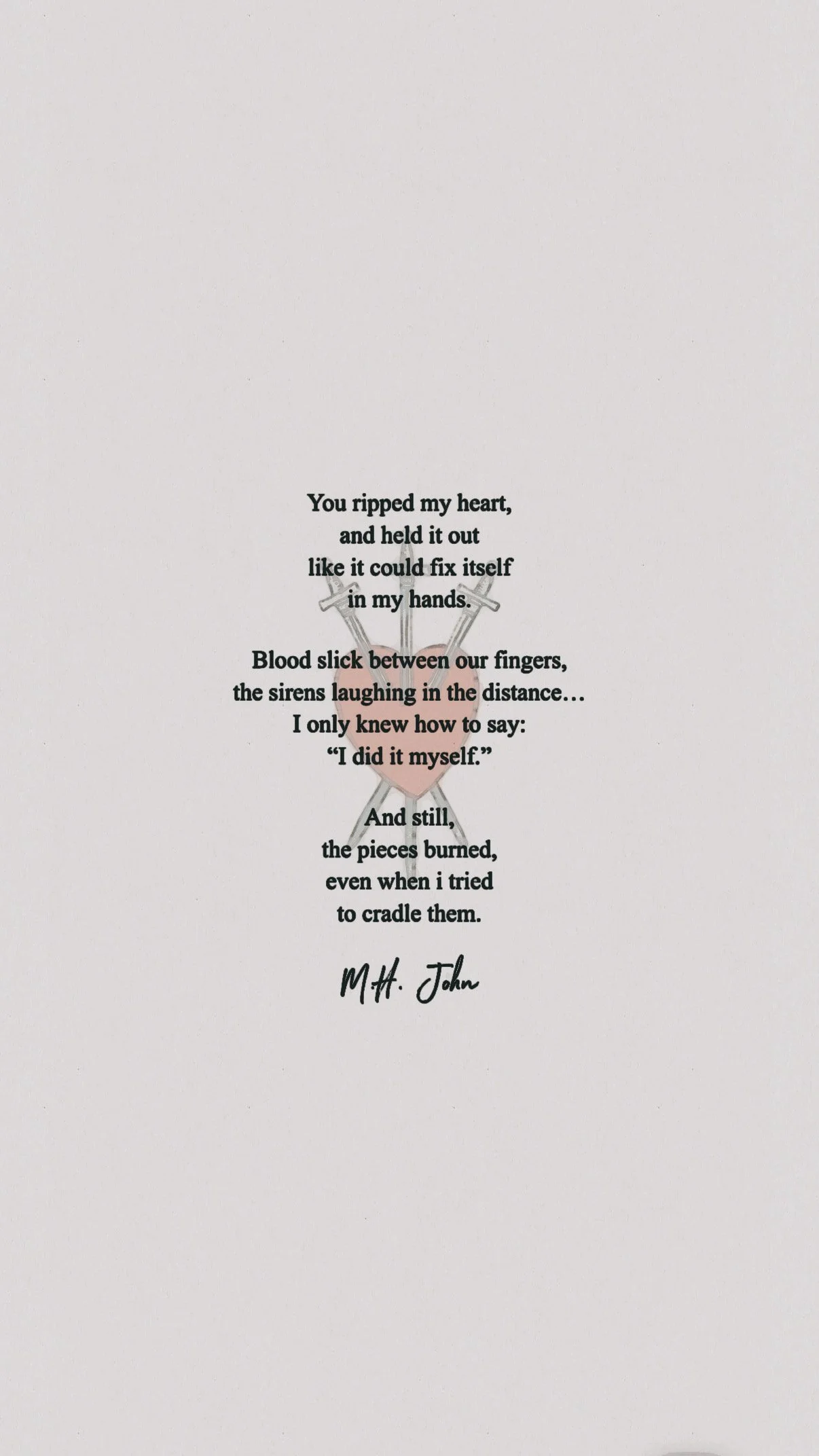 Hello, Operator?M.H. John This poem explores the physical and emotional weight of heartbreak. It captures a moment of intense vulnerability, where the aftermath of pain lingers despite attempts to hold, cradle, or repair what has been broken.