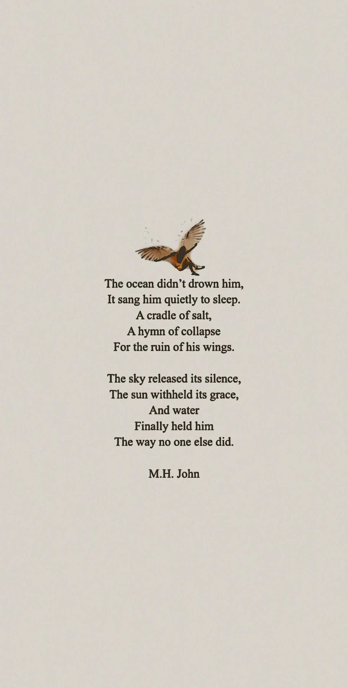 Sometimes when it comes to love, I see it as the sky opening and the sun calling me home. However, when I decide to spread my wings to fly home, I become burned by flying too close to the flames… falling back down into the ocean, where it truly feels like home.