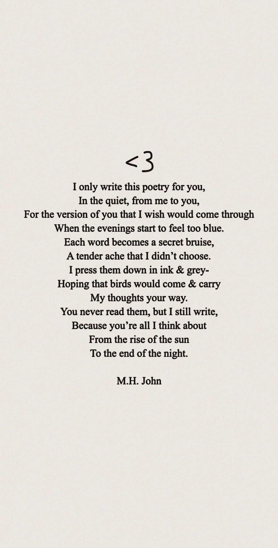 Poetry 4 UM.H. John“Poetry 4 U” is a poem about constantly writing about a specific person in hopes that they will read it. Although they never do… you continue to write about them because you’re so used to doing so.